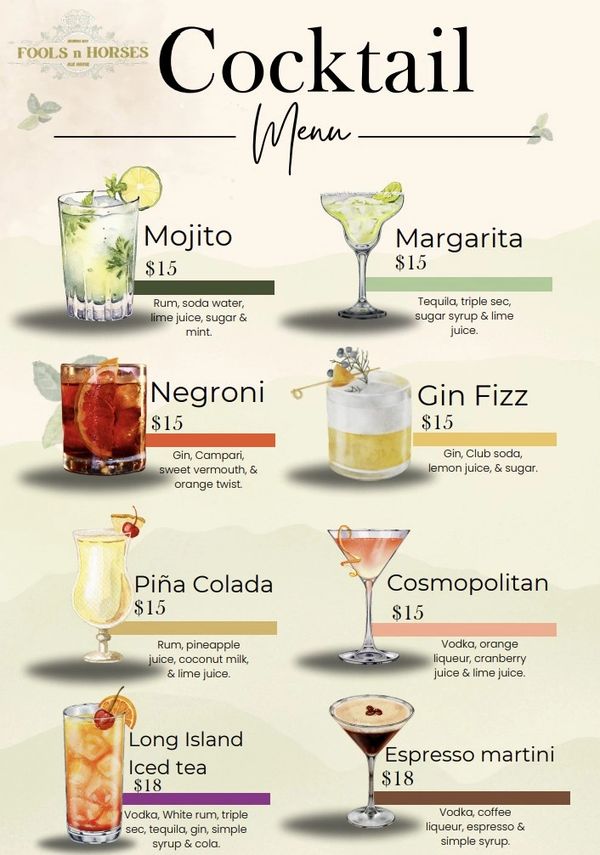 Our cocktail menu is as dashing as Del Boy himself! With a splendid variety of drinks that'll make you say, "Lovely jubbly!" Come and join us for a tipple or two—because you know it makes sense! Don't be a plonker, give them a go!